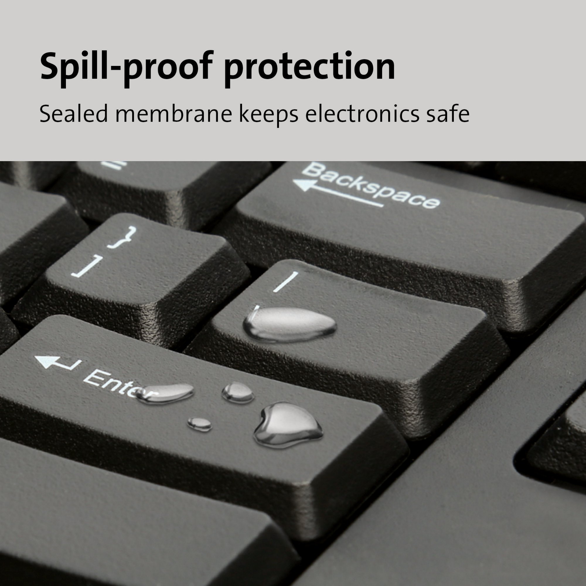 - A sealed membrane design lets liquid from accidental spills run through without damaging keyboard electronics